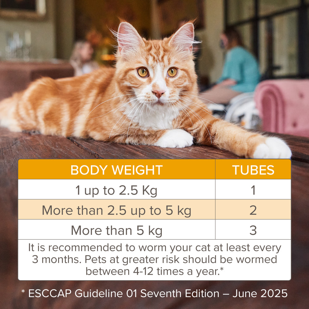 Weigh your cat carefully and use the following table to calculate the correct dose. Apply one tube per 2.5kg of bodyweight.